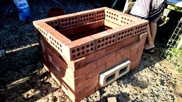 В этом случае увеличивается интенсивность окуривания продуктов дымом за счет большего входного отверстия. Для нормального наполнения камеры достаточно колодца 2 х2 кирпича с внутренним отверстием 25 х 25 см, соответственно.