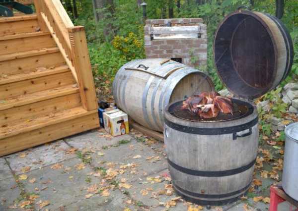 Второй вариант — коптильня холодного копчения своими руками из деревянной бочки, гораздо лучше и практичнее. Бочка деревянная, а значит экологически чистая, да и сама конструкция очень мобильная и легко поместится в пикапчике.