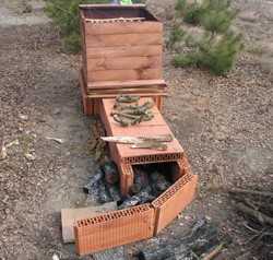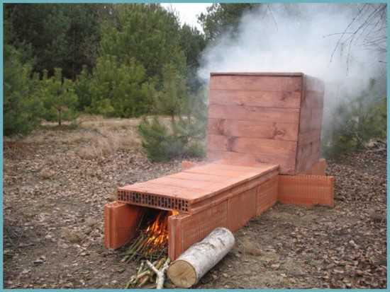 Непосредственно саму коптильню располагают с одной стороны, а с другой – очаг или печку, являющихся источником дыма. Длина дымохода должна быть не меньше 3-х м. Это расстояние необходимо для того, чтобы поступающий для копчения дым успел охладиться до нужной температуры. Для стационарных конструкций роль дымохода может выполнять труба или канал, обложенный кирпичом. Походному же варианту вполне подойдет просто прокопанная под наклоном траншея.