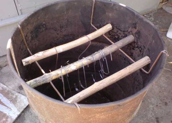 В бочках оптимальным вариантом являются уложенные под 90 градусов прутья, на которых крючками подвешена рыба. В боковых стенках холодильников б/у, выбранных в качестве продуктовой камеры, обычно имеются пазы для размещения решеток.