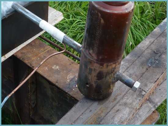 Примечание: Из-за огня днище может прогореть, поэтому необходимо сделать охладитель. Можно обмотать дымоход латунной трубкой и пустить по ней воду.