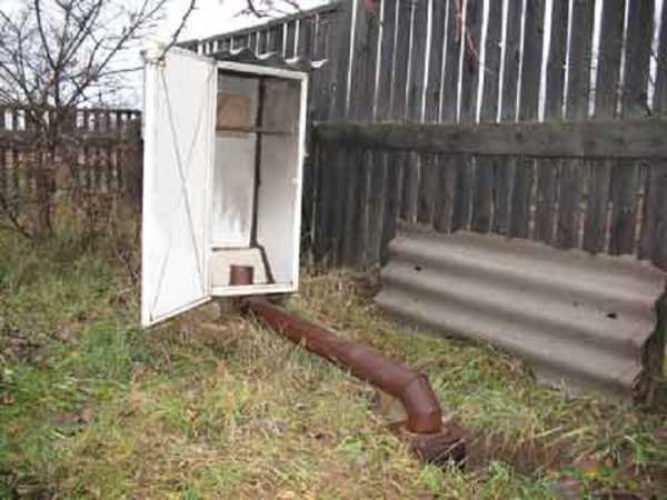 Если у вас отсутствует электрическая плита, то подойдет такой вариант. В нижней части необходимо сделать дыру для железной трубы диаметром 10 см и длиной 2 м. Один ее конец должен вести к яме, а другой – к отверстию в рефрижераторе. На угли поставьте лист с опилками и накройте яму крышкой после появления дыма. Коптилку холодного копчения с подвешенными продуктами плотно закройте.