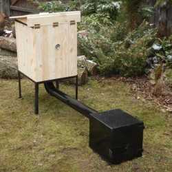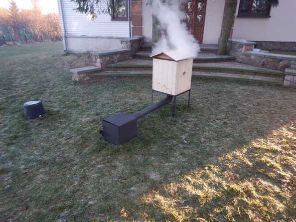 Одним из простых в исполнении дымогенераторов является металлический ящик не слишком больших размеров с выводом дыма через гофрированную трубу. В него закладывают опилки или щепки и ставят затем на огонь. Без доступа кислорода и под воздействием высокой температуры топливо начинает медленно тлеть. Минусами данной конструкции являются сложность за контролем температурного режима и необходимость в достаточно частом добавлении топлива.