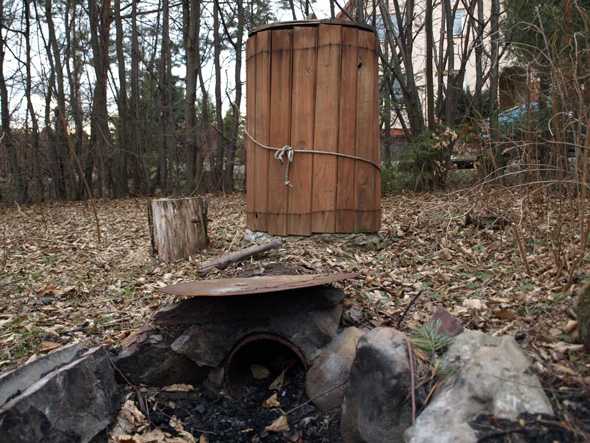 - Выкопать небольшую яму под очаг для коптильни. Здесь можно установить печку или воспользоваться самым простым способом – оборудовать место для костра.