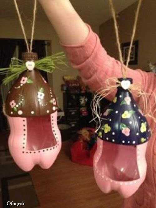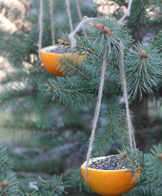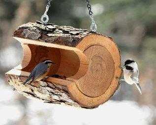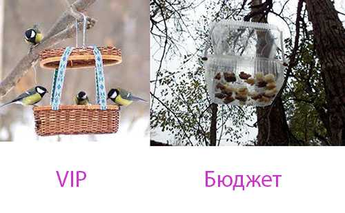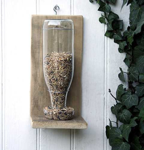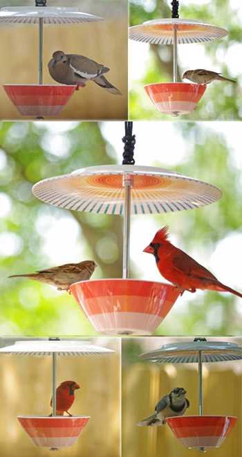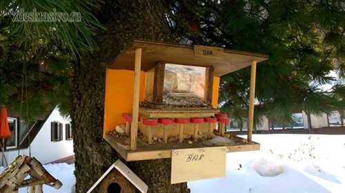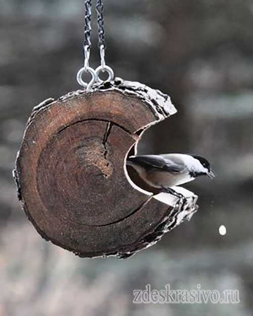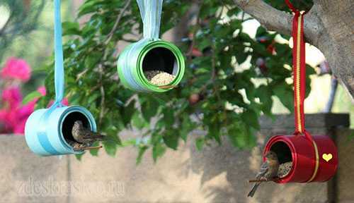 Чаще всего можно встретить такие варианты: деревянные домики, обрезанные пластиковые бутылки разных размеров, подвешенные сетки с провизией, различные подставки и поддоны и так далее.