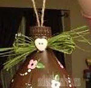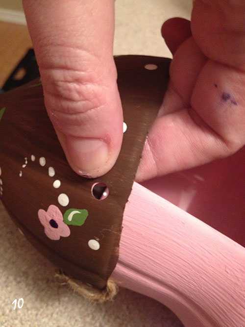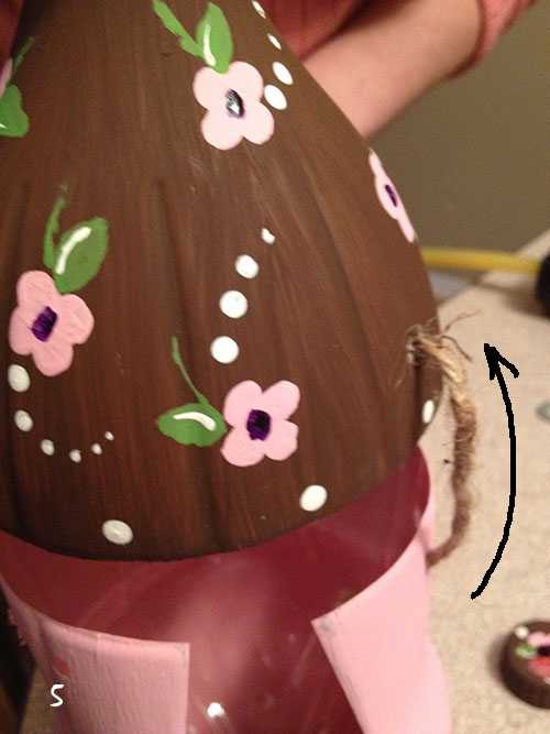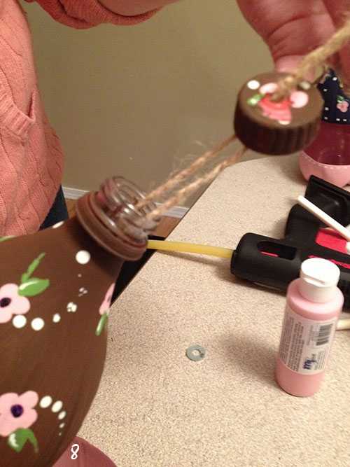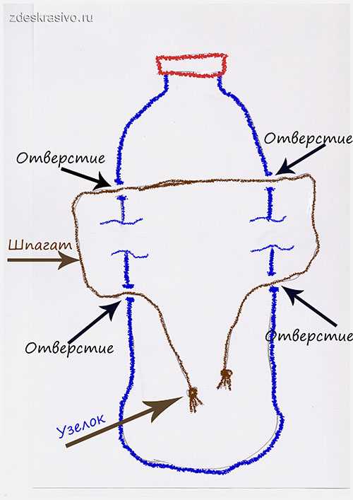 6.Раскрасьте верхнюю часть бутылки и пробку не забудьте. Дайте высохнуть.7. Шпагат будет продеваться по схеме: