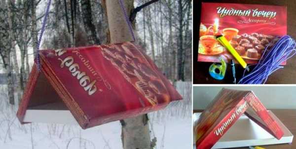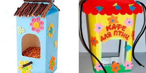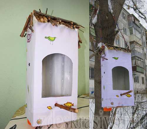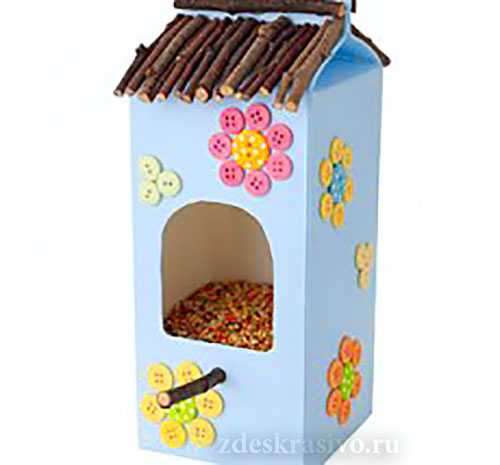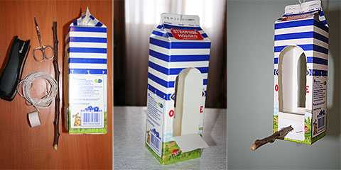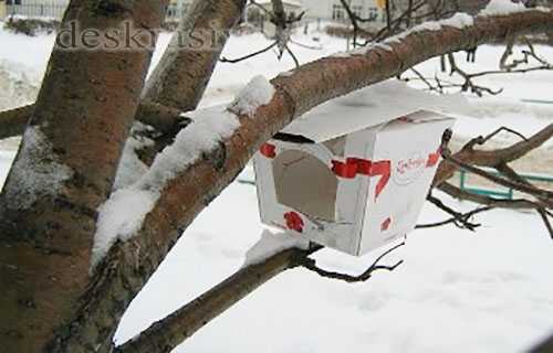 Кормушка из пакета молока будет хорошим решением, поскольку применяемый в них картон подвергается ламинированию.