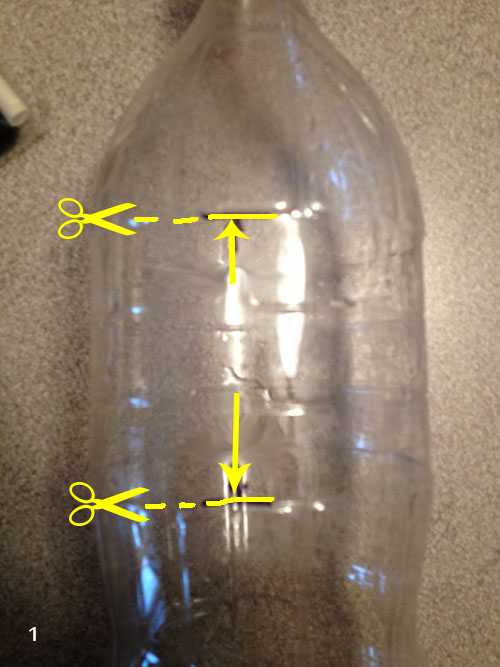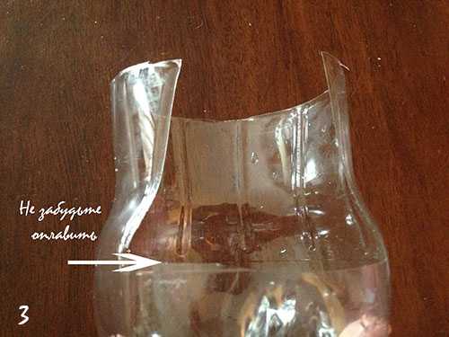 Высота кормушки зависит от высоты вырезанного куска3. В нижней части бутылки вырежьте отверстие для посадки птиц, как показано на фото. Не забудьте пройтись по краю окошечка раскаленным ножом так, чтобы оплавить срез и сделать его не острым. Птичка будет садиться на край окошечка лапками и не должна порезаться.