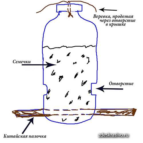Самая простая самодельная птичья столовая, позволяющая насыпать полную бутылку семечек, так как маленькое отверстие не дает семечкам высыпаться.