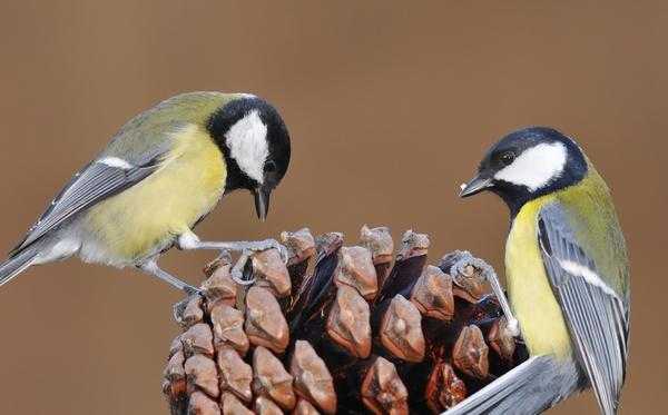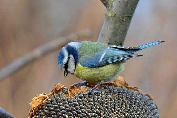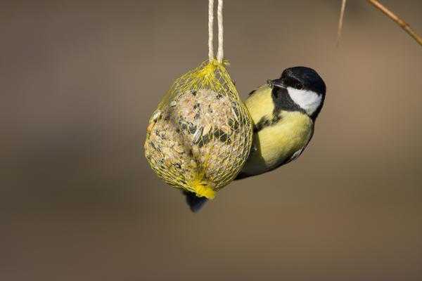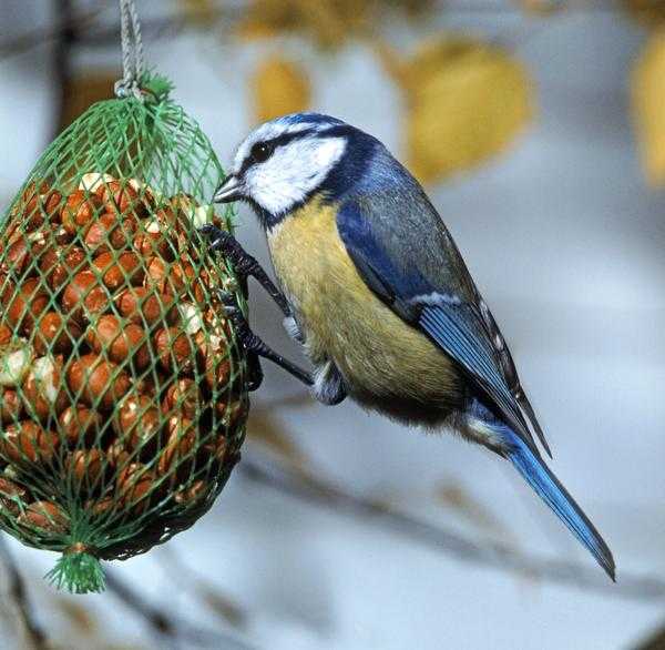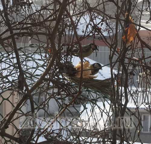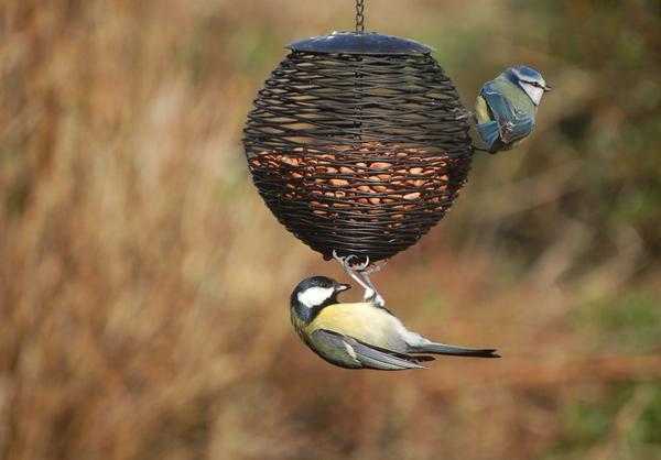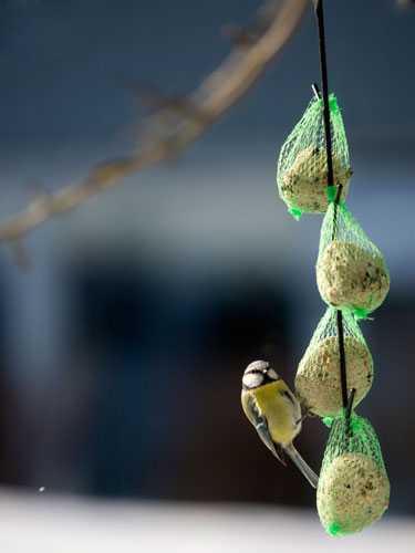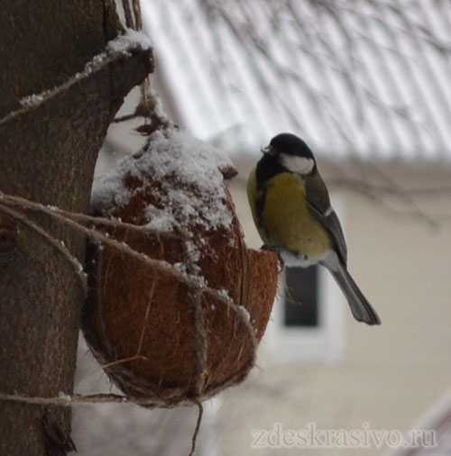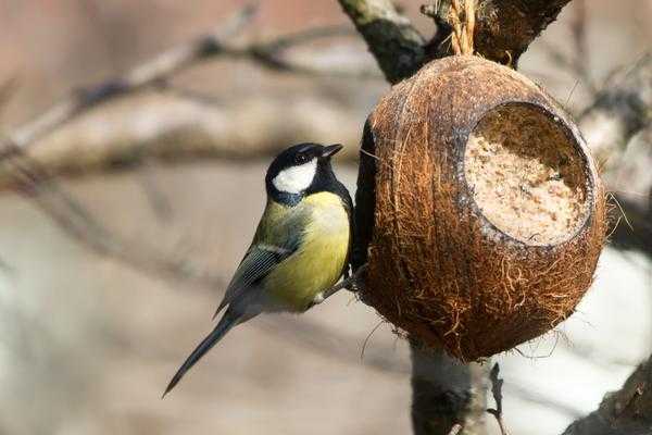 Для подкормки синиц подойдут нежареные подсолнечные семечки, несоленое сало, жир, орехи (расколотые, с мягкой мякотью, например грецкие) и экзотический вариант -распиленный кокосовый орех, подвешенный на веревочке.