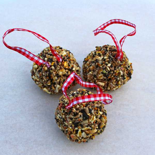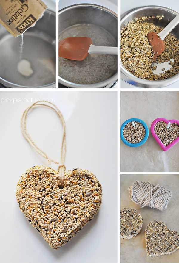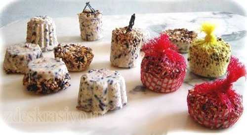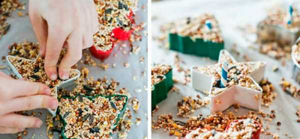 Такую интересную кормушку можно сделать очень просто: перемешаем воду с желатином, доведем до кипения. Затем добавляем различные семена, плотно распределяем по формочкам, вставляем по одной трубочке, чтобы получилось отверстие для веревки, ждем, когда подсохнет. Вешаем с помощью веревки на дерево.
