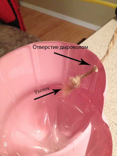 Шпагат соединяет верхнюю и нижнюю часть кормушки, а узелки протягиваются вверх, через отверстие в пробке8Сделайте отверстие в пробке, возьмите узелки и протащите два конца шпагата за узелки через отверстие в пробке.