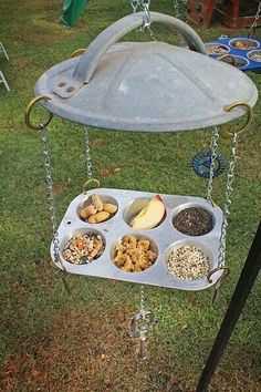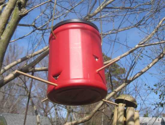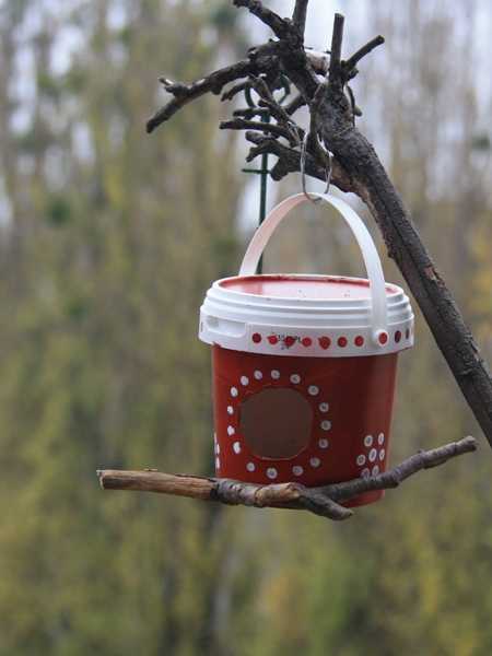 Идея бара для птицИз пластиковых ведерок для майонеза.