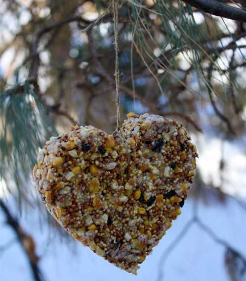 Сало и семечки — любимое и простое угощениеРастопленным салом заливают не только семечки, такую смесь, как в этом «сердечке» можно сделать самим (см. инструкцию ниже), а можно купить птичий корм в зоомагазине.
