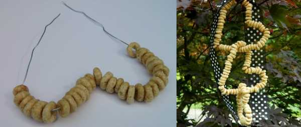 Гирлянда — кормушка. Нужно продеть толстую проволоку через хлопья, закрепив потом сердечки друг на друге.