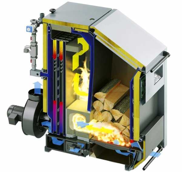 Принцип работы пиролизного котла Работа пиролизного котла не может осуществляться без электрической энергии, которая обеспечивает работу вентилятора поддерживающего процесс горения принудительным способом.