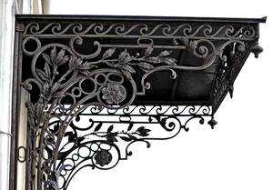 Кованые козырьки и навесы не только защищают от дождя, снега и сосулек, но и с успехом выполняют декоративную функцию.