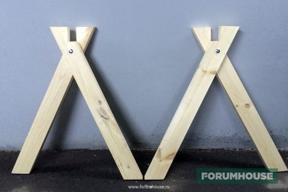 Верхние концы рам соединяются при помощи дверных навесов, а для того, чтобы ножки фиксировались, надо предусмотреть ограничитель. Это может быть и такая конструкция, как придумал тот гражданин в синих малоэстетичных джинсах, но проще всего не усложнять жизнь, а взять два отрезка стропильной ленты и зафиксировать ее на нижних распорках но таком расстоянии, чтобы козлы были устойчивыми.