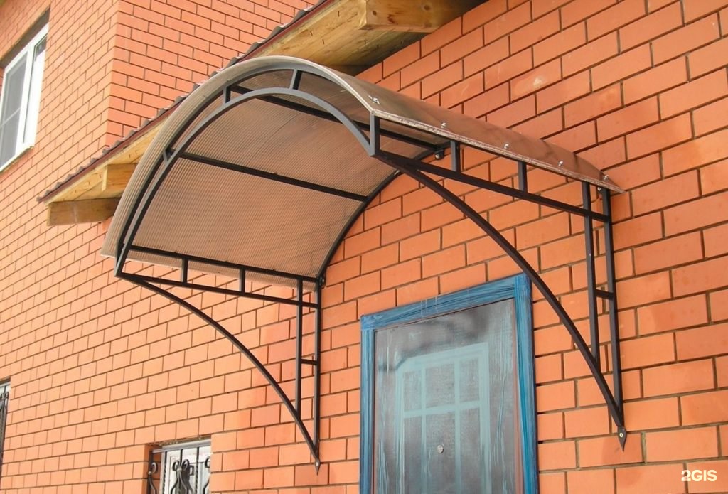Во-первых, из-за того, что снеговая нагрузка на кровлю арки минимальная. Кроме того, такая конструкция выглядит изящно и прекрасно сочетается с кованными скругленными элементами, которыми почти всегда декорируют козырьки. В-третьих, такой козырек над дверью из профилированного листа, как и все полукруглые конструкции, словно тянется вверх, из-за чего может показаться воздушным. Но это и не кажется, ведь из-за скругленной формы под ним и правда больше места, чем под козырьком двускатного типа.