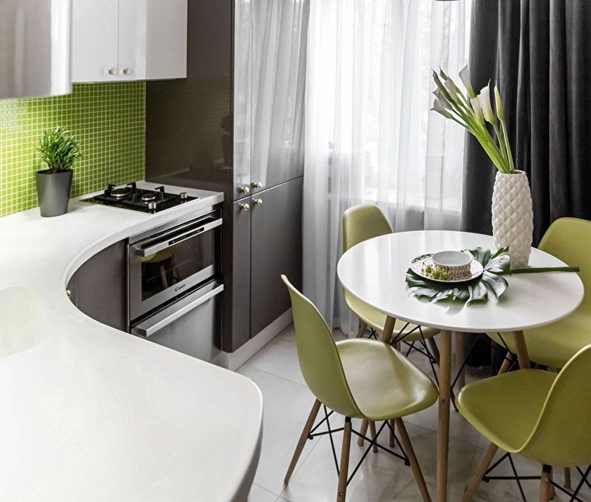 Даже если кухня совсем маленькая, это не повод полностью отказываться от обеденной зоны: проблему помогут решить раскладные стулья и стол-трансформер.