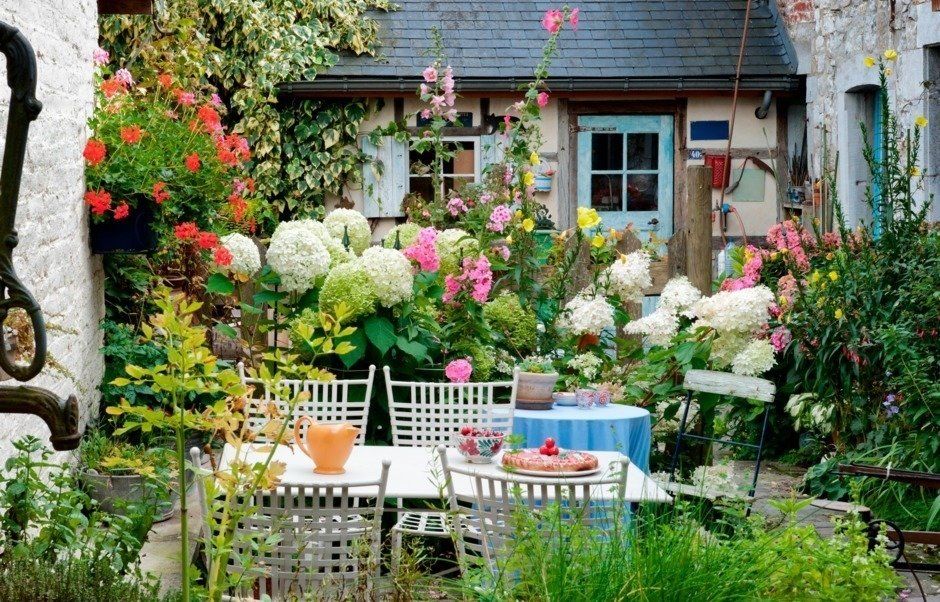 Дизайн внутреннего дворика может быть различным. Зачастую его размещают у задней стены дома или в саду. Если такой возможности нет, то роль ограждения могут играть живые изгороди из кустарников или вьющихся растений. Размеры такой площадки обычно не превышают 4 кв. м., а сама она дополняется стандартным садовым гарнитуром – столиком и стульями или скамейками.