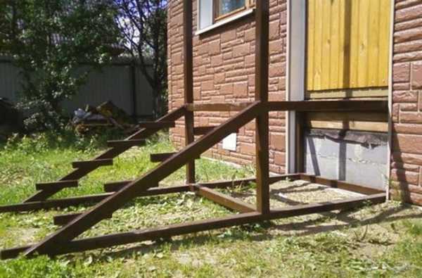 Самым простым способом сделать деревянное крыльцо является сооружение деревянного короба со ступенями. Он устанавливается на основание из щебня или бетона. Можно сделать деревянные ступени крыльца по принципу лестницы по косоурам.