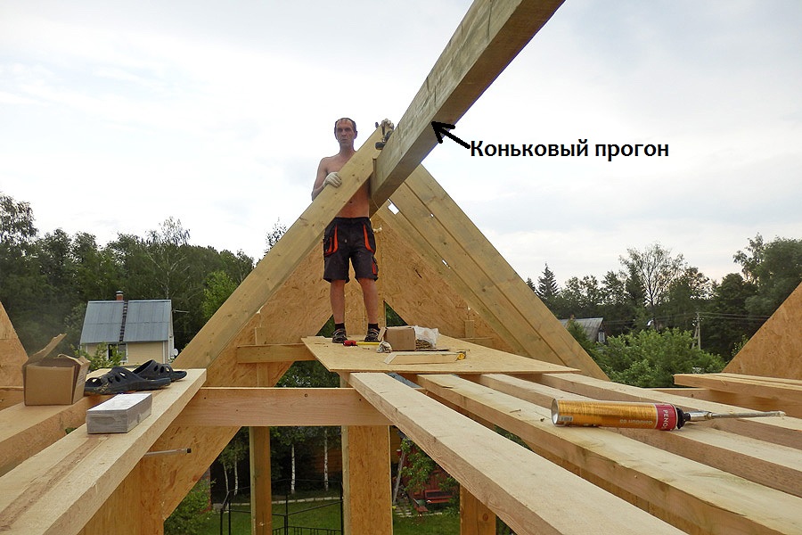Следующий шаг – монтаж упоров и прогонов. Для того, чтобы уменьшить нагрузку от давления скатов крыши на прогоны, а также обеспечить их жесткую фиксацию, используются ригели – доски сечением 150х40-150х50 мм. Монтаж ригелей начинается с центральной части постройки в направлении наружных стен.