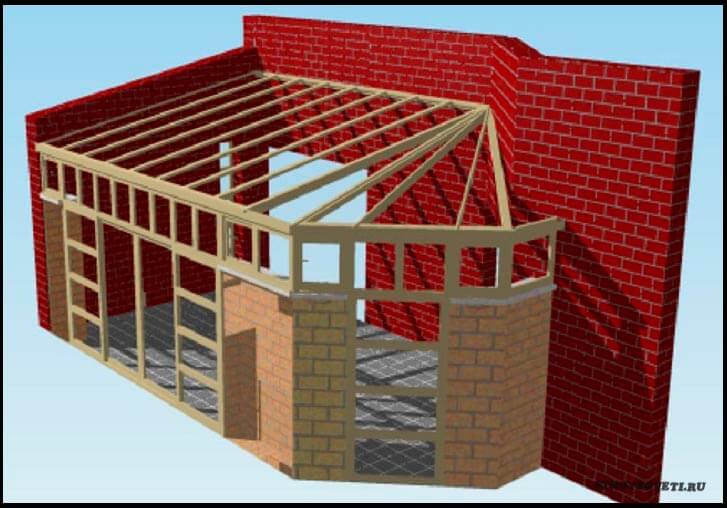 - При строительстве важно прежде всего рассчитать вес конструкции крыши для пристройки, определиться с практичным углом ската крыши, затем проводится монтаж каркаса, устанавливается стропильная конструкция, укладывается кровля.