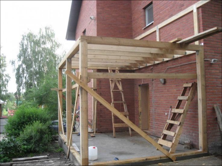 - На стены постройки укладывают основание кровли из бруса. Монтаж осуществляется при помощи скоб, гвоздей или стальных шпилек, если пристройка выполнена из кирпича или камня. Можно использовать стальную вязальную проволоку, которую необходимо соединить с анкерами, закрепленными на стене.