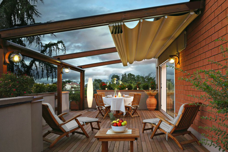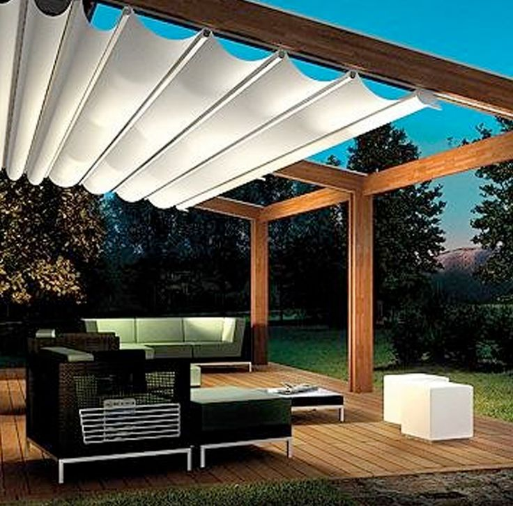 - Есть еще вариант сделать тентовую крышу с телескопической системой, то есть, при необходимости такую крышу можно отодвинуть и тогда над вами будет открытое небо. Такая крыша вполне защитит от солнца, осадков, пыли, но если хочется больше простора и свежего воздуха, то ее легко можно отодвинуть. Если вы делаете веранду с такой крышей, то пристройкой к дому это считаться не будет, то есть, узаконивание строительства не требуется.