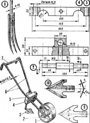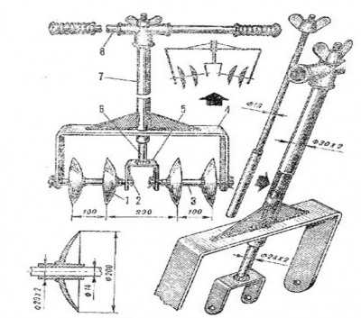 Рабочим органом дискового культиватора являются полусферические выпуклые диски, приваренные к втулкам. По два полусферических диска надеты на две оси, концы которых закреплены в скобах шплинтами.Труба 7 с поперечной перекладиной, в которую ввинчиваются рукоятки 8 проходит через специальный уступ, приваренный к большой скобе 4. К малой скобе 5 приваривается конец штока длиной 250мм и диаметром 24х2мм с глухим резьбовым отверстием, в которое ввинчивается стержень диаметром 16мм, верхний конец которого (с барашками) выступает над поперечной перекладиной.Стальные диски 1должны иметь полусферическую форму, а сделать их с такой формой из обычных стальных пластин толщиной 4мм нелегко. Нужно сильно ударяямолотком, «выбивать» чаши из заготовок.