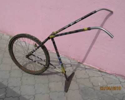 - К раме старого велосипеда крепим культиваторную головку, это может быть часть старого культиватора, железные прутья или же маленький плуг, сапа.