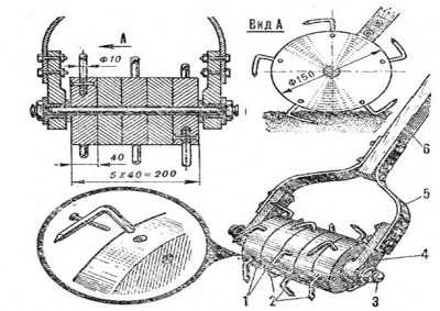 Так же есть вариант самодельного ручного культиватора, который делается из стальных дисков. Всего дисков должно быть пять, на трех из них крепятся зубья, с помощью которых будет происходить рыхление почвы. Такие диски можно сделать самостоятельно или же заказать. Ведь делаются они на токарном станке. Два диска будут гладкими, а в три остальных будут закреплены специальные зубья или изогнутые гвозди. Когда диски готовы, они поочередно одеваются на ось, потом ставятся подшипники и шайбы, а после вся конструкция крепится к деревянной рукоятке. Культивируется почва при помощи этих зубьев, они поочередно вонзаются в землю и рыхлят ее. Также эти зубья подрезают корни сорняков. Из-за своего веса этот ручной культиватор не требует особого применения силы. Единственный недостаток в том, что периодически придется очищать зубья от сорняков. Ведь срезанная трава цепляется за зубья и разносится по всему участку.