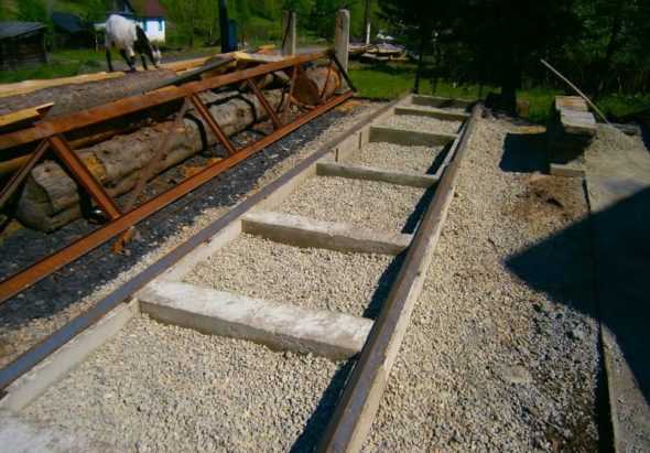Чтож принцип работы надеюсь понятен, далее стоит позаботится о размещении рельсовой дороги по которой будет ходить каретка с пильным полотном и распускать бревна на доски. Площадка должна быть размерами не менее 3 х 6 м, а самое главное ровной! Поэтому необходимо под пилораму залить плиту-фундамент и выровнять до идеально ровной поверхности. Копается углубление, укладывается песчаная подушка и заливается армированная плита из бетона.