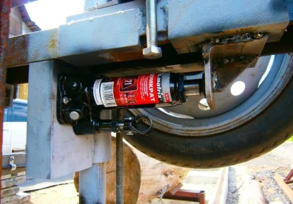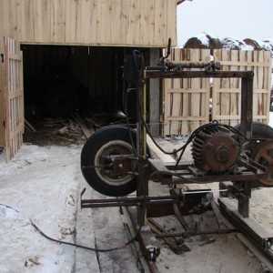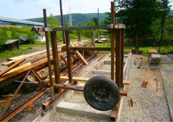 Довольно простой моделью считается та, в которой используется колеса от легкового автомобиля. Она же является и самой распространенной среди самодельных. Размеры ленточной пилорамы будут несколько больше, чем со станиной.
