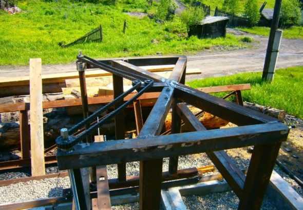 Что касается материалов, то здесь используется только металл. Это обусловлено тем, что вес самой конструкции и вес бревен достаточно большой. Однако здесь нужно знать, какой металл куда сгодится. В качестве движущейся части, то есть тележки, можно использовать толстостенную профилированную трубу прямоугольного или квадратного сечения. К примеру, опорную раму для ленточной пилорамы своими руками в домашних условиях можно собрать лишь из швеллера. Рельсы для тележки могут быть сконструированы из габаритного уголка, минимум, 450. Однако здесь можно использовать и швеллер, но с меньшими линейными характеристиками.