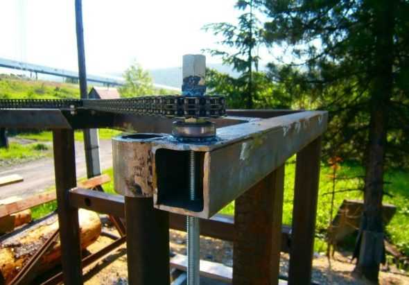 Когда делалась ленточная пилорама своими руками, то трубки профильные («шпалы») были изготовлены так, что выступают за рельсы. На выступающих частях стоят болты (M14 x 100 мм) для регулировки. Кроме этого, на профильных трубах сделаны «мостики» — перемычки, на которые кладут бревно перед обработкой. На случай заготовок маленькой длины, последние две перемычки установлены на расстоянии полуметра друг за другом.