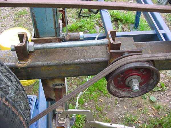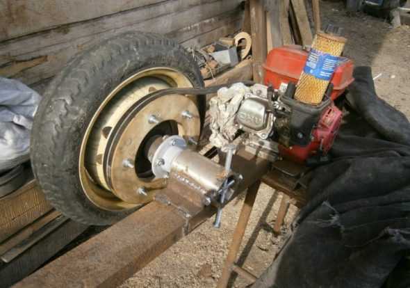 Шкивы были подточены так, что надетый ремень на несколько сантиметров выступал. Для корпусов шкивов использовались ступицы от автомобиля «Москвич», приваренные к трубками.