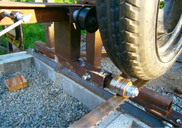 Далее идет установка самой рельсовой дороги, ее в лучшем случае можно сделать из рельс от узкоколейной железной дороги, но таковое трудно достать, так что придется делать из швеллера либо уголка. Обратите внимание!!! На фото уголок расположен ребром вверх.