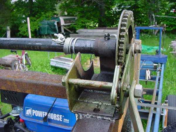 Между этими профильными трубками, приварена полудюймовая труба, а не ней уже закреплены когти — крепеж для бревна. Данные когти свободно наклоняются и перемещаются, а когда нужно зафиксировать бревно, то по зажимам производится несколько ударов молотком, в результате этого происходит самозаклинивание фиксирующего механизма.