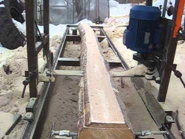 После полной сборки пилорамы проводится пробный запуск, если все в порядке, то отключается двигатель и укладывается и крепится бревно.