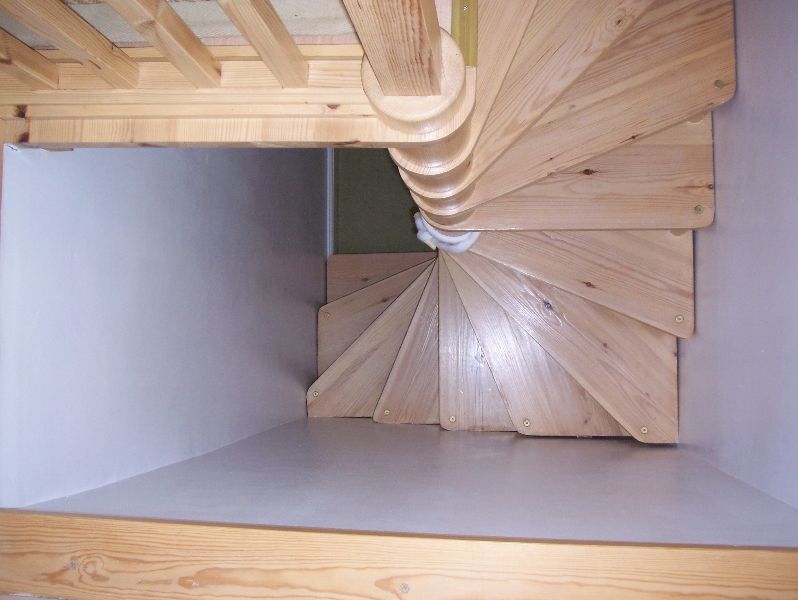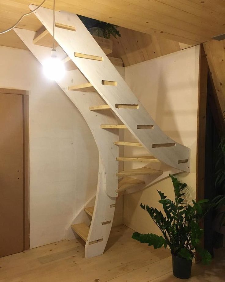 Винтовая – самый экономичный вариант из всех, поскольку занимает меньше всего места. Способна преобразить и сделать оригинальным любой интерьер. Состоит из забежных ступеней, крепящихся к центральной оси (опорному столбу). Но при этом, винтовые мансардные лестницы весьма неудобны, поскольку на них можно легко оступиться. Кроме того, стоит позаботиться об установке надежных перил и устройстве дополнительного освещения подъема на мансарду.
