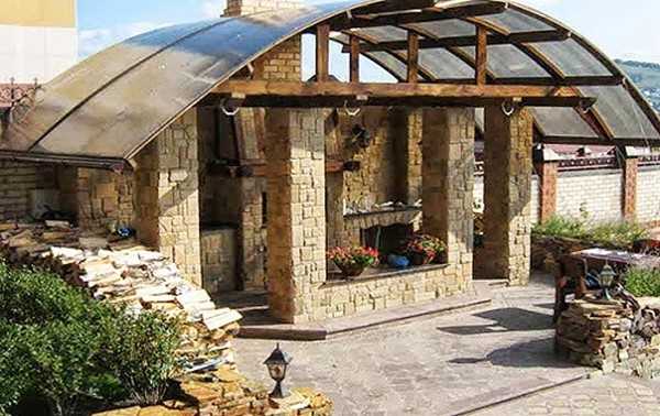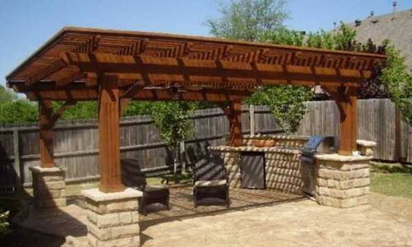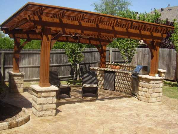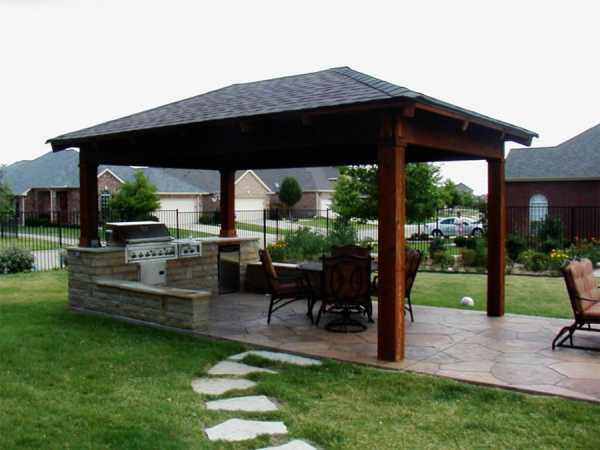 Самые простые конструкции кухонь открытого типа – фундамент и площадка из природного или искусственного камня, опора и крыша – деревянные. Если устанавливается печь – ее нужно облицевать камнем.