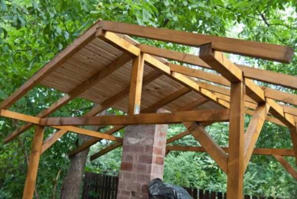 В принципе, плоская крыша, которая в большинстве случаев устанавливается на летние кухни, является несложным изделием, особенно если учесть, что каркас для нее представляет не что иное, как обыкновенные прямые балки, уложенные на основание крыши и надежно прикрепленные к нему. В дальнейшем поверх этих балок нашивается либо сразу кровельный материал, либо плита ОСП – здесь все зависит от выбранного вами типа кровли. К примеру, для мягкой черепицы нужны плиты ОСП, а вот для профнастила или металлочерепицы такая плита не нужна.
