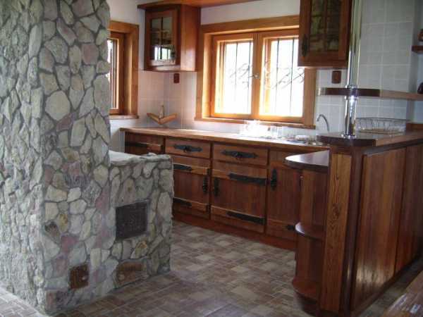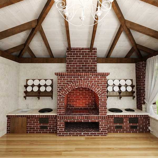 Главное назначение кухни – готовка пищи, поэтому основным элементом в ней является печь. В закрытой пристройке к дому лучше сделать ее из кирпича или установить газовую, что значительно ускорит процесс приготовления еды. В открытом варианте центральное место займет мангал или барбекю.