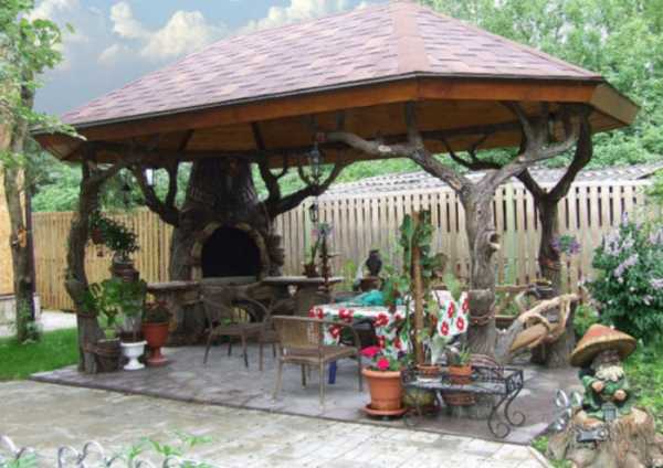 - Декоративный бетон. В проекте открытой кухни на фото из декоративного бетона на арматурном каркасе сделаны опоры в виде сказочных деревьев и мангал в виде ствола с дуплом. Получилось красиво и необычно. В качестве аксессуаров выступают цветы в горшках, садовые статуэтки и подходящий текстиль.