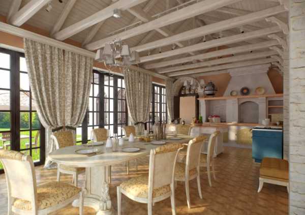 - если кухня совмещена со столовой или беседкой — обеденной зоне,