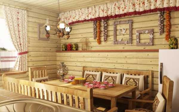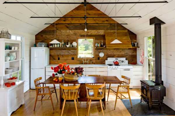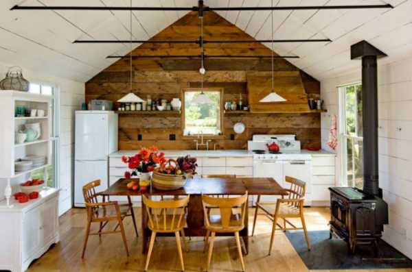 Основной отделочный материал в этом стиле — дерево. Мебель тоже лучше сделать деревянную. Вместо стульев, можно поставить скамьи, пеньки или бочки. Пеньки и бочки перед использованием следует покрыть лаком. Центральное место на летней кухне в деревенском стиле занимает дровяная печь. Из аксессуаров подойдет льняная вышитая скатерть, рушники, глиняная или деревянная посуда, самовар. При таком оформлении окна можно украсить легкими занавесками из натуральных тканей. Пример деревенского стиля — на фото.