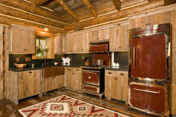 - Дерево — натуральный и экологически чистый материал. Способствует созданию здорового микроклимата, но плохо переносит высокую влажность и может начать гнить. Чтобы предотвратить гниение, поражение насекомыми и плесенью, дерево обрабатывают специальными составами. Лучше использовать дерево для отделки кухни закрытого типа. Стены обшивают вагонкой или блокхаусом, а пол делают из покрытых лаком досок.