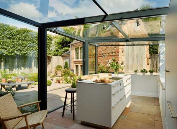 Закрытые варианты летних кухонь выбирают тогда, когда хочется превратить их из простого места приготовления пищи в удобное место семейного отдыха. В теплые дни помещение, часто представляющее собой застекленную веранду, может использоваться как дополнительное место ночлега. Зимой здесь часто хранят припасы, овощные и фруктовые заготовки.
